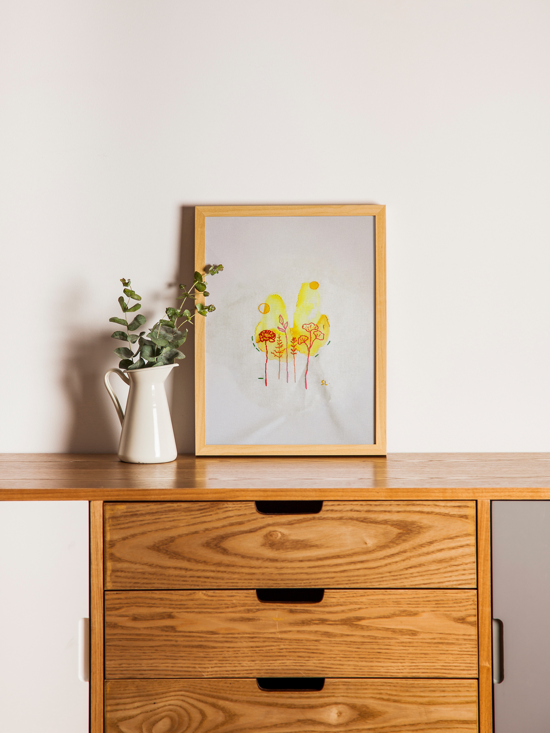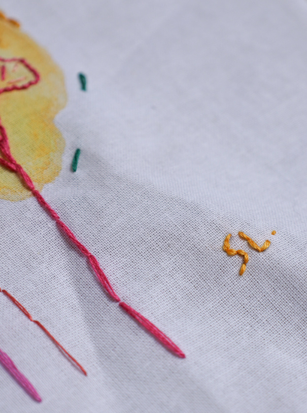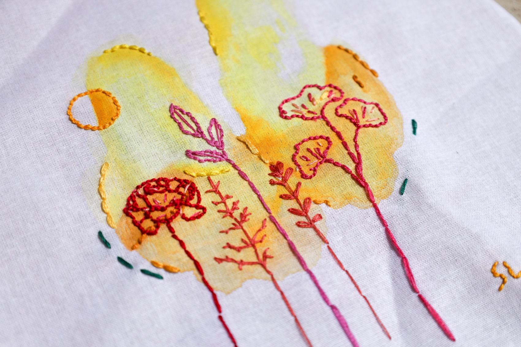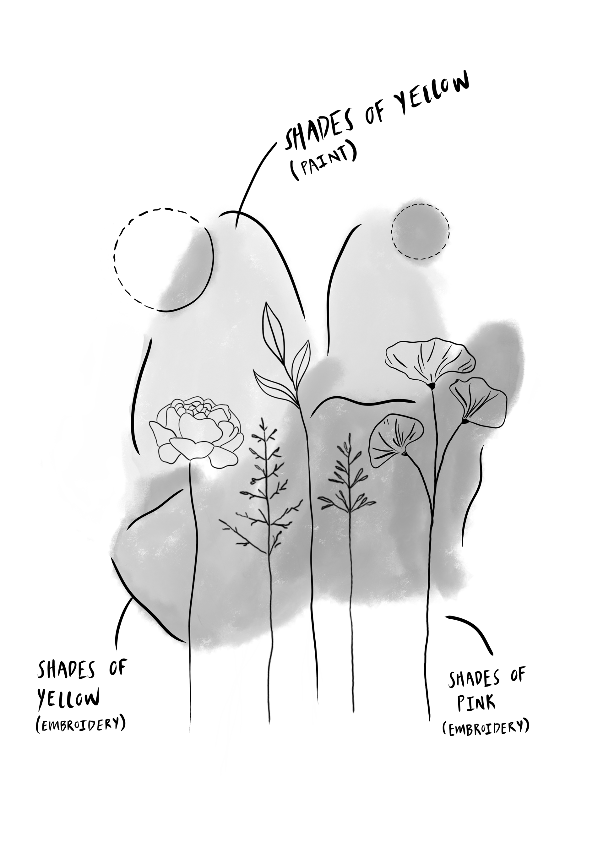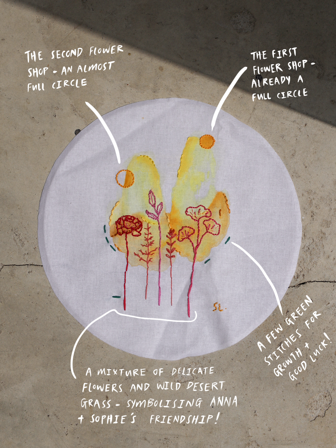 Sophie is a florist living in Namibia. Anna is a designer living in South Africa. They have been friends since 2000! Sophie recently celebrated two things - her birthday and the birth of her second flower shop! Anna asked me to create a textile work for Sophie that she could frame and hang in one of her flower shops! And, boy did I have fun creating this piece! I love it when clients give me the freedom to create and conceptualise as a project develops. This process resulted in a simple pop of colour that's drizzled with so much symbolism - scroll down to read what every stroke and stitch means!