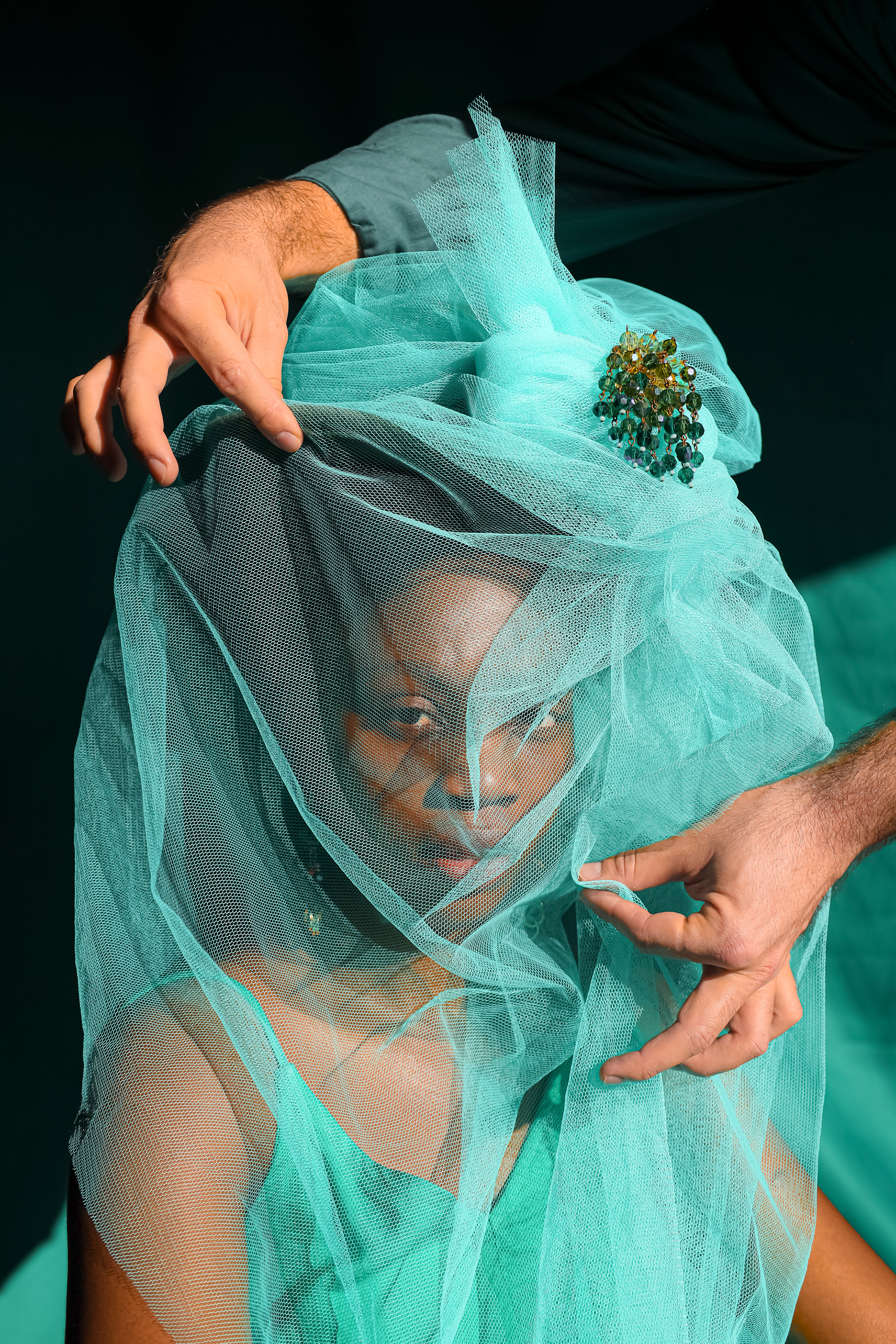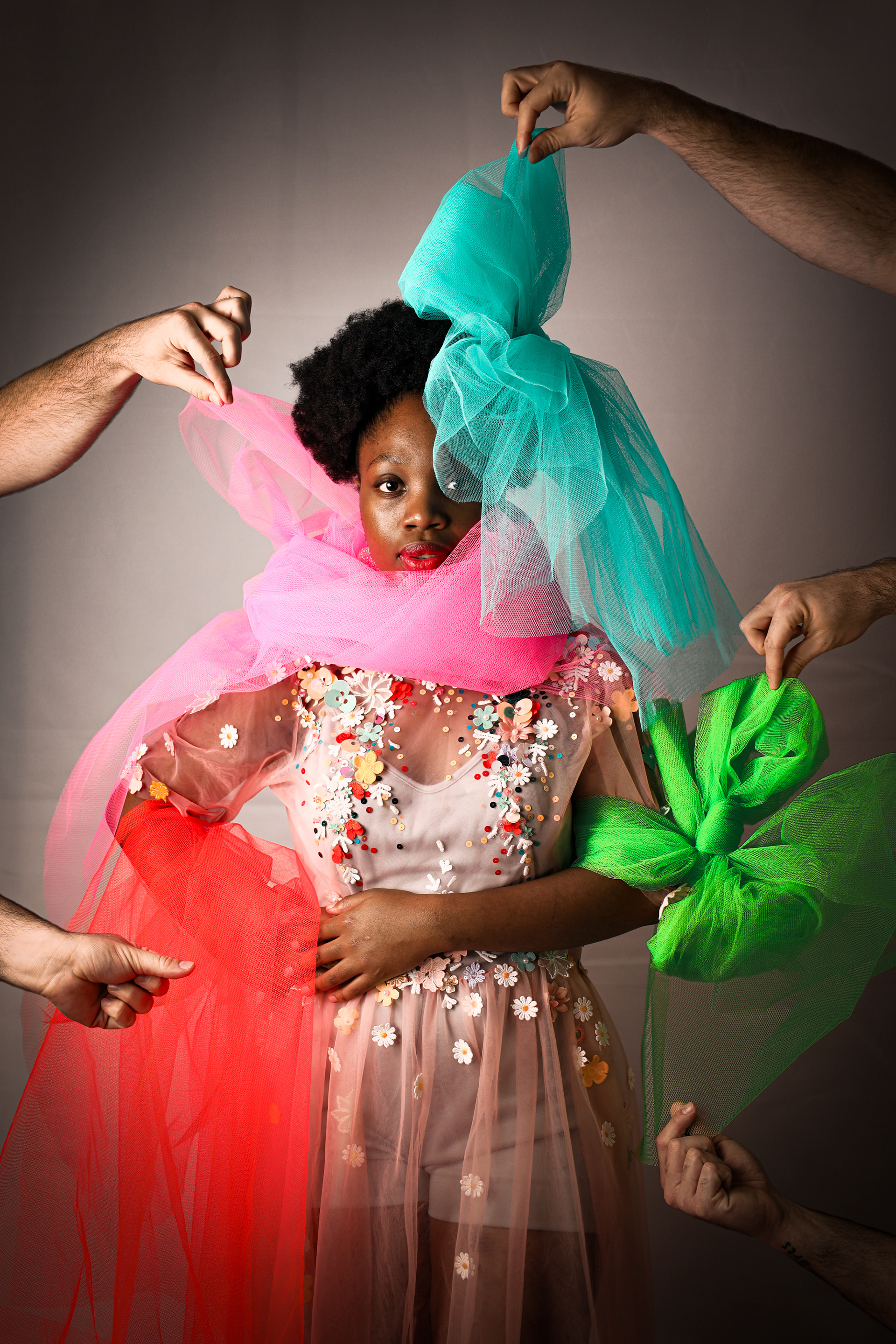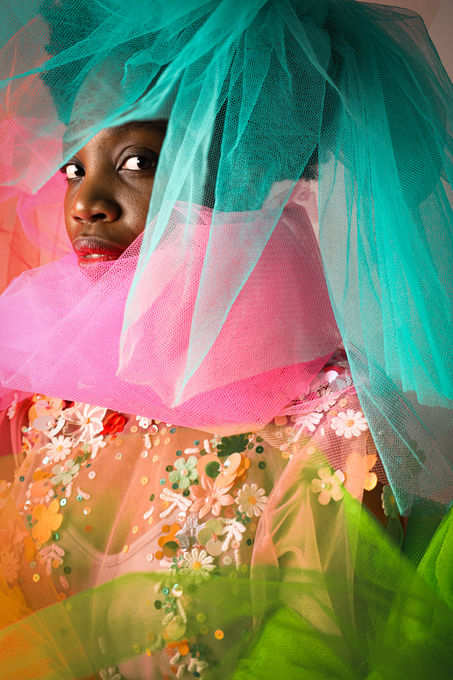 Theatre of Fabric(ation) is a study of the relationship that emerges between the self and creativity. The subjects featured in this series are not professional models but rather two veterinary professionals working nine to five jobs. They are rarely able to express themselves outside of the capitalistic workspace. This conceptual project provided them with a stage on which they could become actors in the theatre of fabrications: an alternative reality, a dreamscape.The series aims to capture the nudges that creativity gives us until we finally decide to collaborate with it. Out of this collaboration sprouts a process of colourful discovery and bold self-expression. This encounter with creativity leaves us in a state of calm – knowing that our collaboration was fabricated and unlived, but as we return to reality it travels with us as an ideal of what could be different.