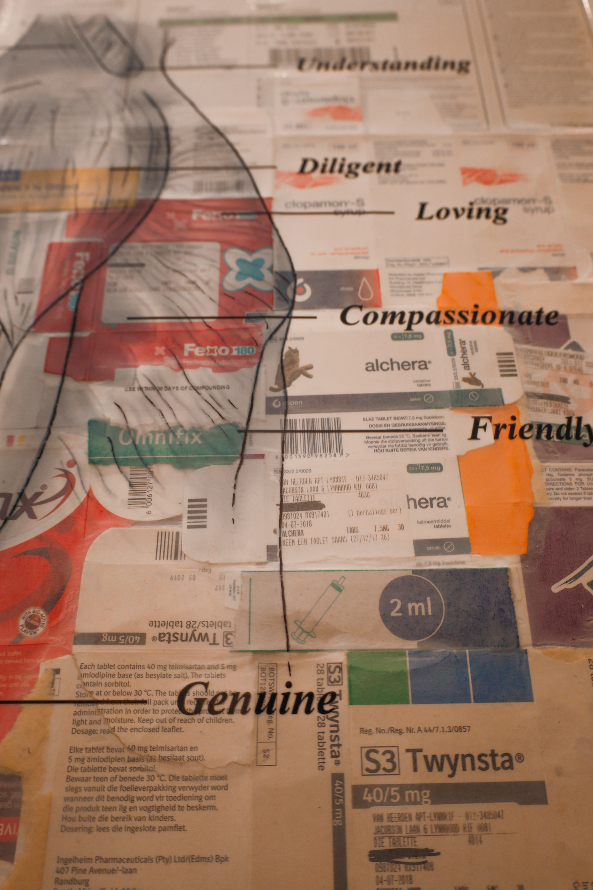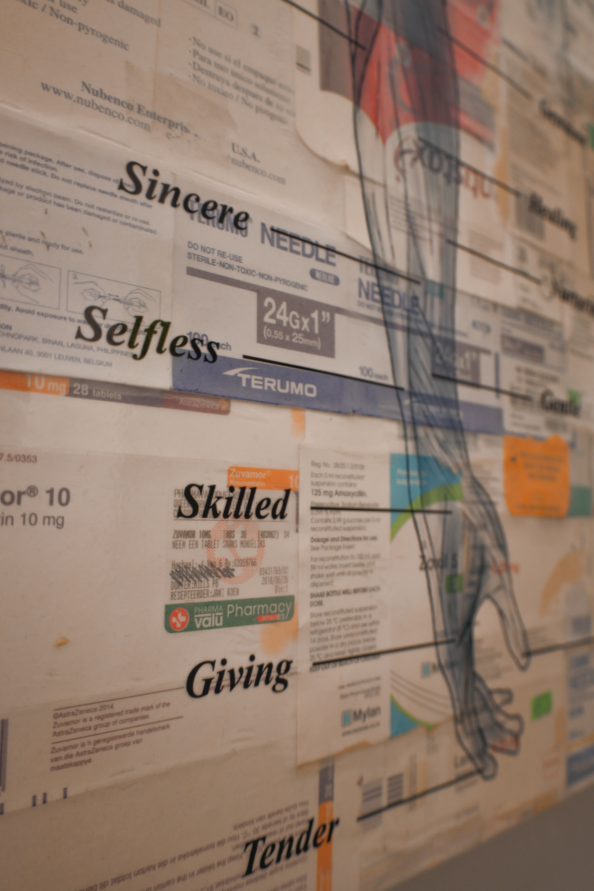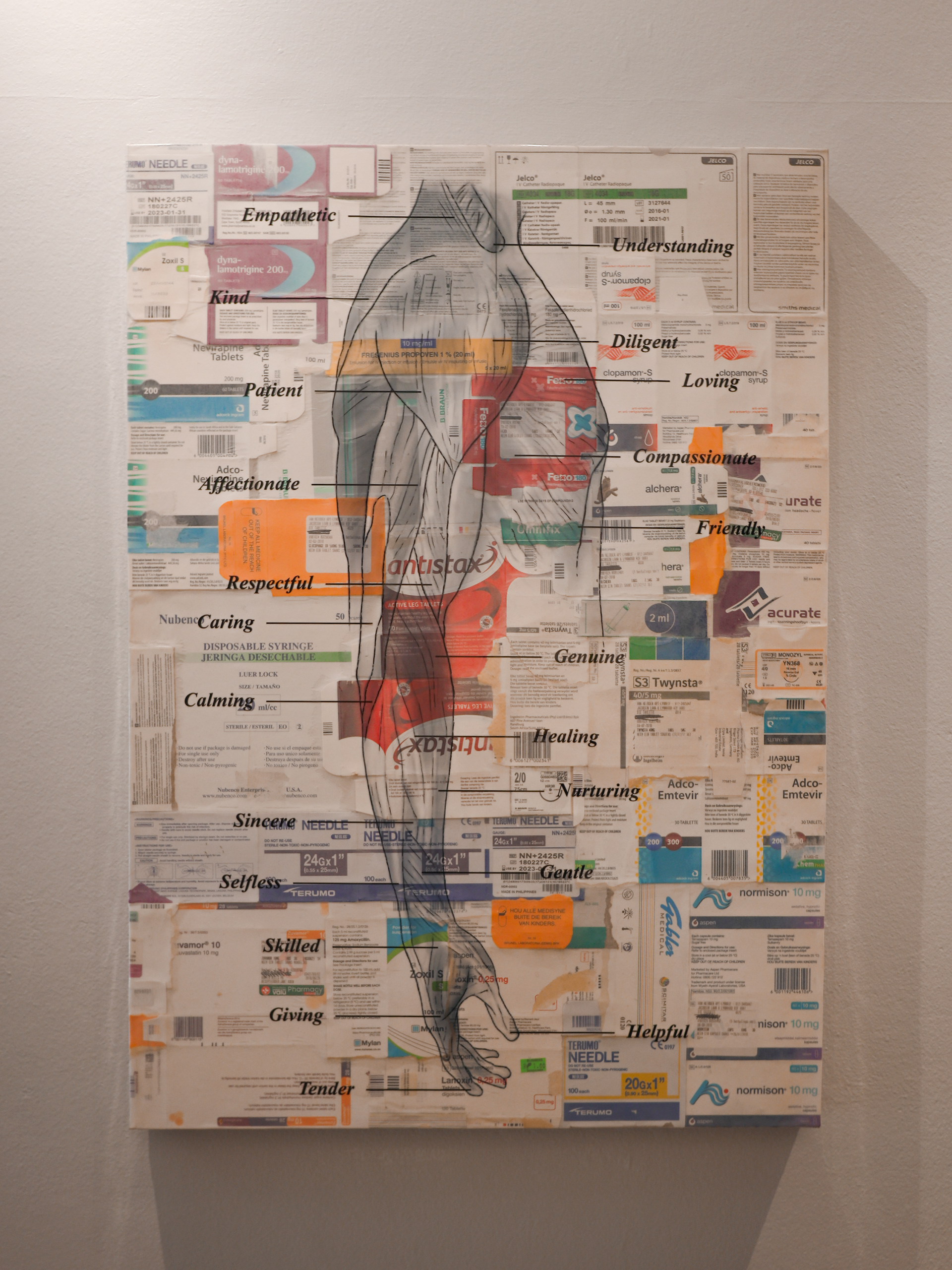 Caregiver’s Gift gives thanks to the caregivers of the Sediba Hope Medical Centre through celebrating their human qualities. The caregivers of Sediba are the women and men who venture into the streets of Pretoria with the purpose of helping the people living on these streets. This artwork represents the body and helping hand of the caregiver, drawn in a textbook style covering medicine boxes. In this artwork, however, the usual Latin muscle names become human qualities – loving, tender, kindness. All the qualities that the caregivers possess. As they move and breathe these qualities this work celebrate them for it!