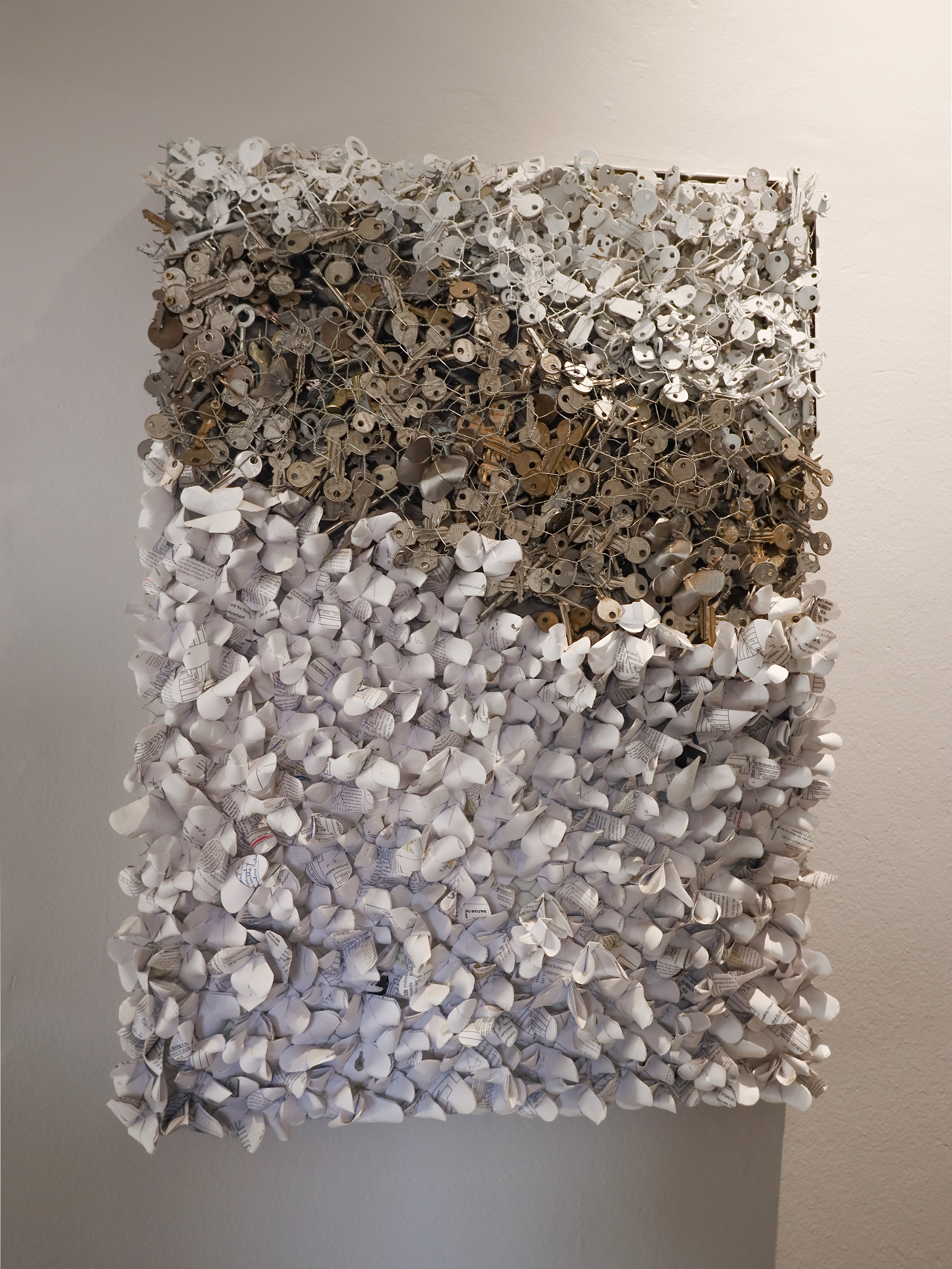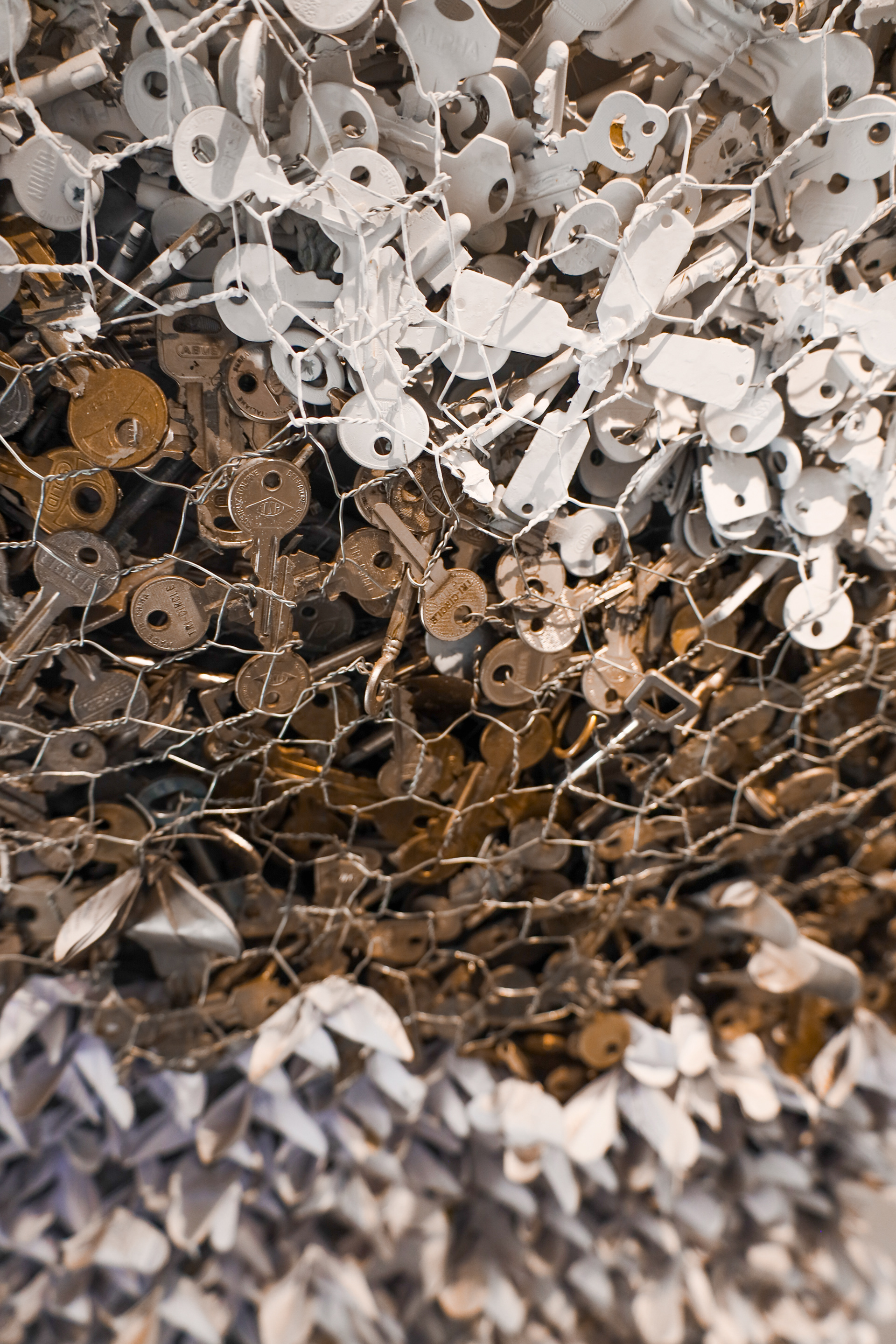 This artwork portrays the journey of the men who join PEN's Bathesda Project for vulnerable men. The piece creates a visual metaphor between the men and butterflies. The artwork is divided into three stages. In the first stage, men who live on the street come to the shelter like fragile, vulnerable butterflies. Their wings are easily torn, like paper. They find a place of belonging (literal keys to a home) allowing them to be strengthened in the process. This is symbolised by the metal keys. In the third stage, the metal butterflies become white again. This portrays, how having been strengthened and empowered, they take flight on a new path of dignity and independence.