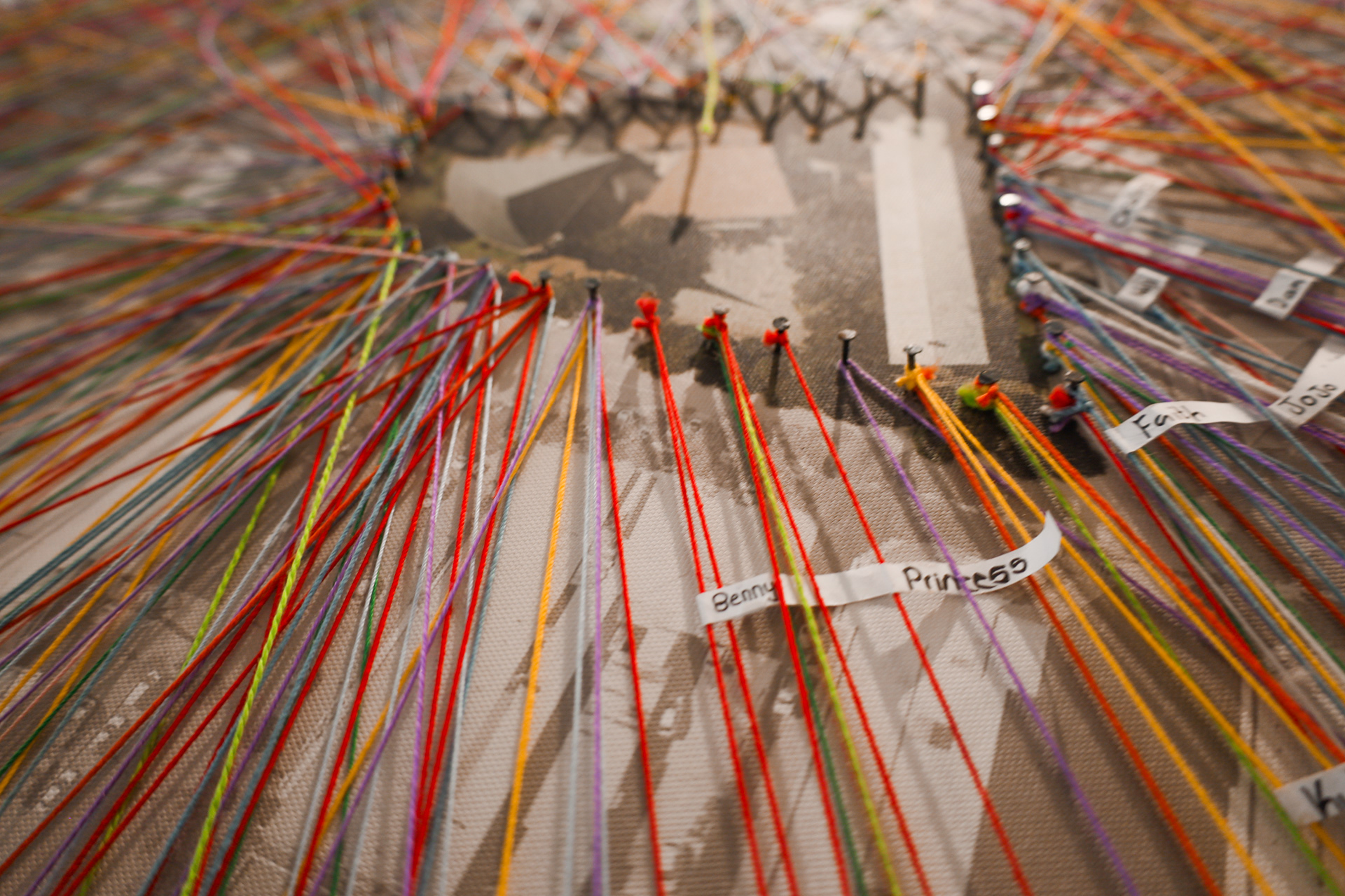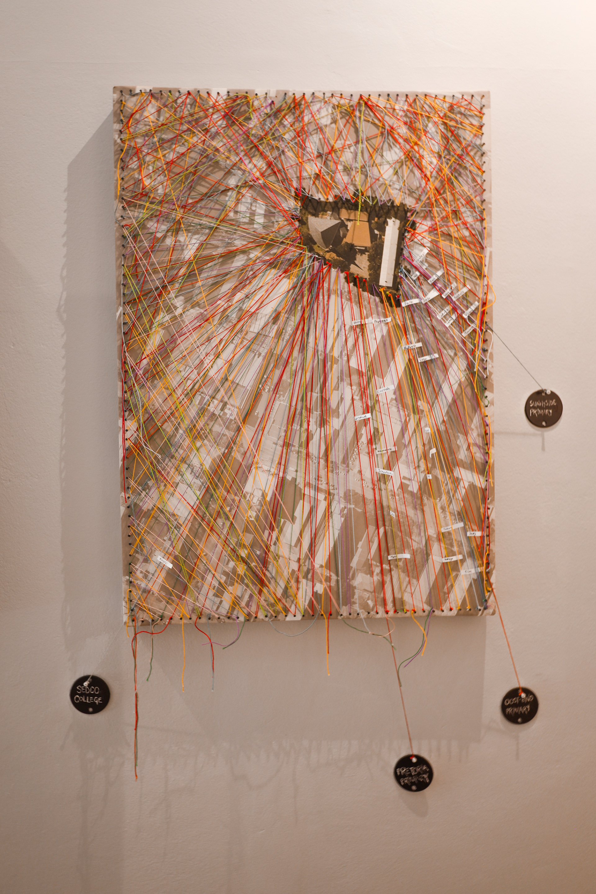 Walking Wool captures the essence of PEN's Ignite Education Centre, located in Sunnyside, Pretoria - depicted in the aerial photograph featured in this artwork. In the photograph, Bronberg Church, the heart of the Education Centre, stands out with vibrant colours against the grayscale backdrop of the surrounding area. The bright woollen strings symbolise the dynamic flow of people through Sunnyside, weaving in various directions. The strings attached to the circular plates represent the children of the Education Centre. These strings trace their journey from their schools, symbolised by the circular plates, to the safe haven of the Education Centre. Each individual string is adorned with a child’s name written in their own handwriting to symbolise their pedestrian journey. While the rest of Sunnyside is a tangle of strings, mimicking its bustling and chaotic nature, Bronberg Church remains a serene and uncluttered space—a sanctuary filled with calm, security, and love. This artwork reflects the Education Centre as a refuge and nurturing ground for each child.