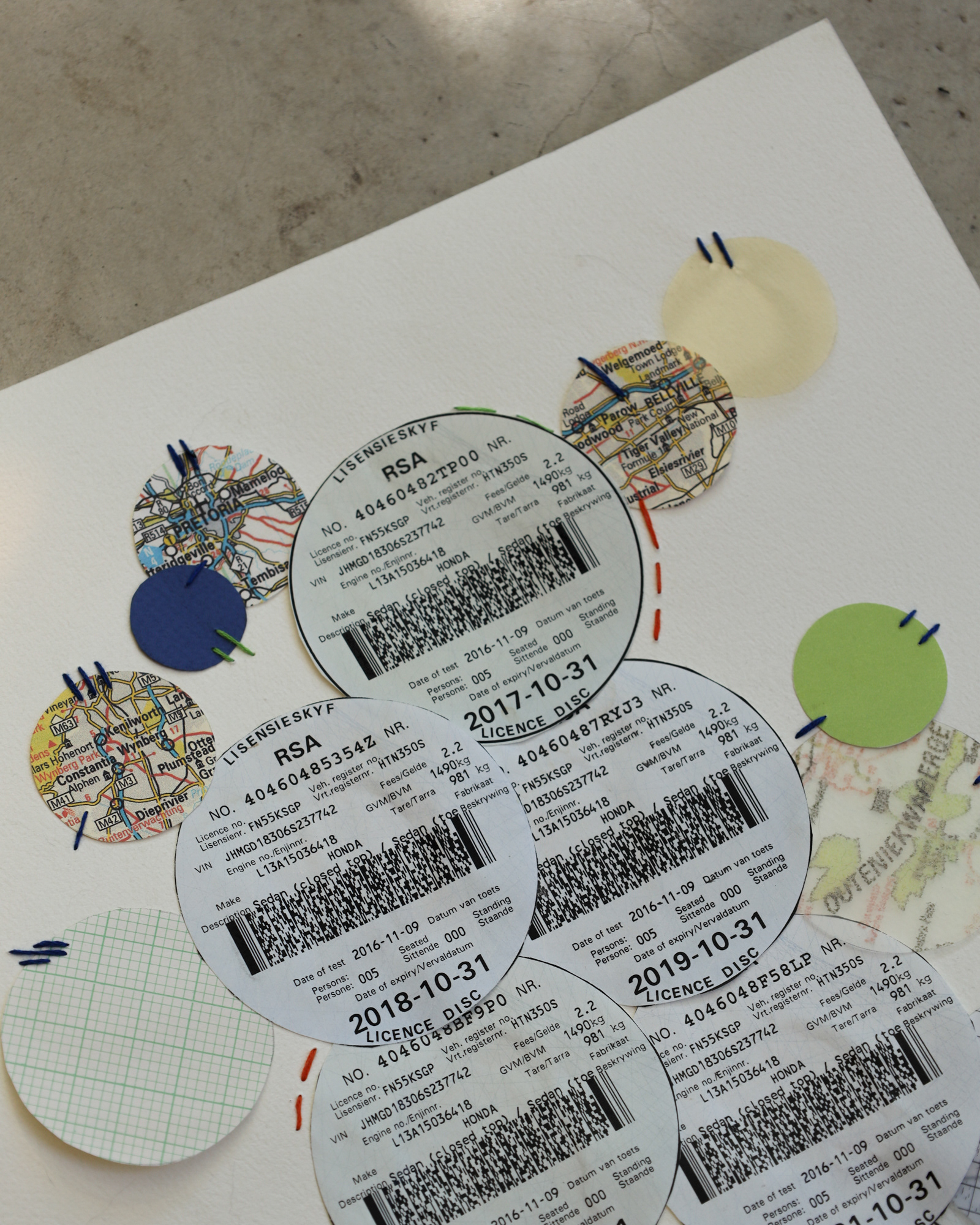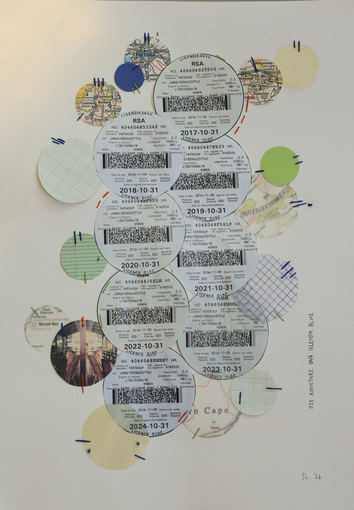 In 2006, my grandfather bought a blue Honda Jazz. Ten years later, in 2016, he passed it on to my father when he could no longer drive. In 2017, I started driving the blue Honda Jazz and gave her a name: Glenda Blue. (Glenda comes from Glentana - the place where my father’s family and now our whole family often go for holiday!) For my father's 59th birthday, I wanted to create something special for him. I opted for a symbolic piece made from Glenda’s license disks (from my time driving her) and maps representing significant places in both my father’s life and mine. Every stitch and circle in this work carries meaning—scroll down to see the story they tell!